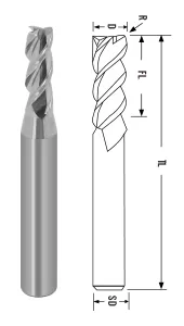Fresa de topo de raio de canto com 3 flautas para alumínioN.º de encomendaD h7[mm]R[mm]FL[mm]TL[mm]SD h6[mm]